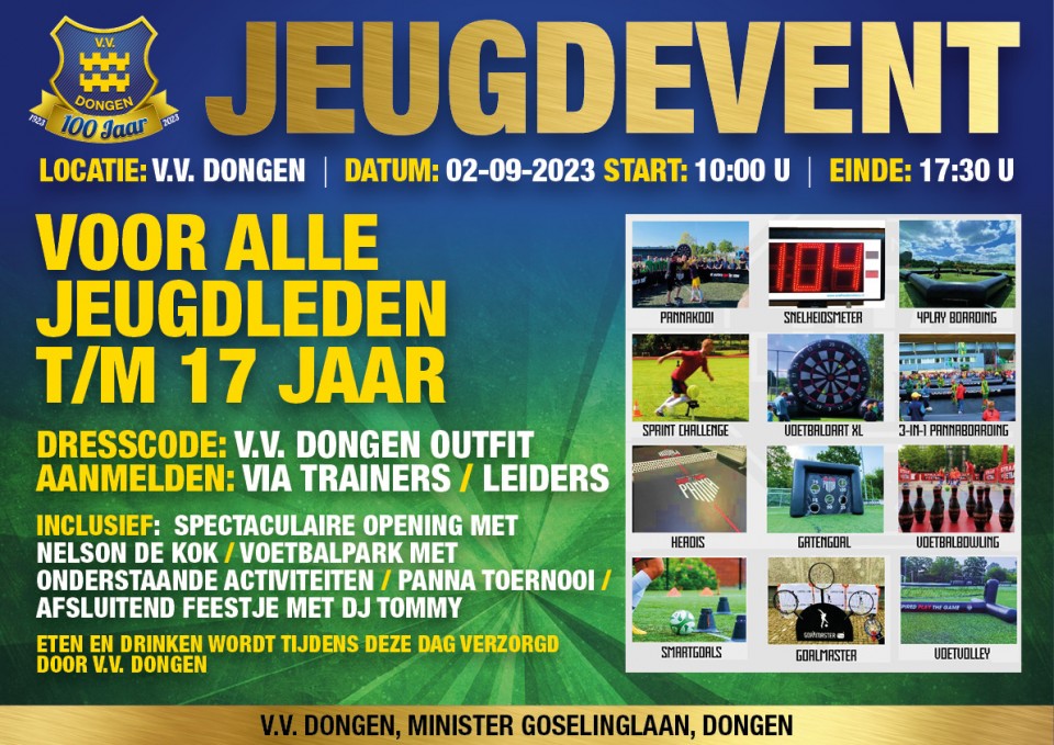 Zaterdag 2 september 2023 organiseert VV Dongen een geweldig jeugd evenement voor alle leden tot en met 17 jaar. Het wordt een dag vol spektakel, vermaak en activiteiten met onder meer:
