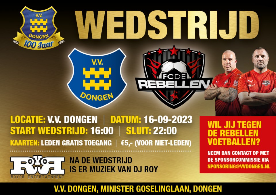 Op zaterdag 16 september neemt een team van VV Dongen het op tegen de levende legendes van FC De Rebellen. Spektakel, humor én een knallende derde helft - inclusief DJ én een borrel met De Rebellen zelf - gegarandeerd!