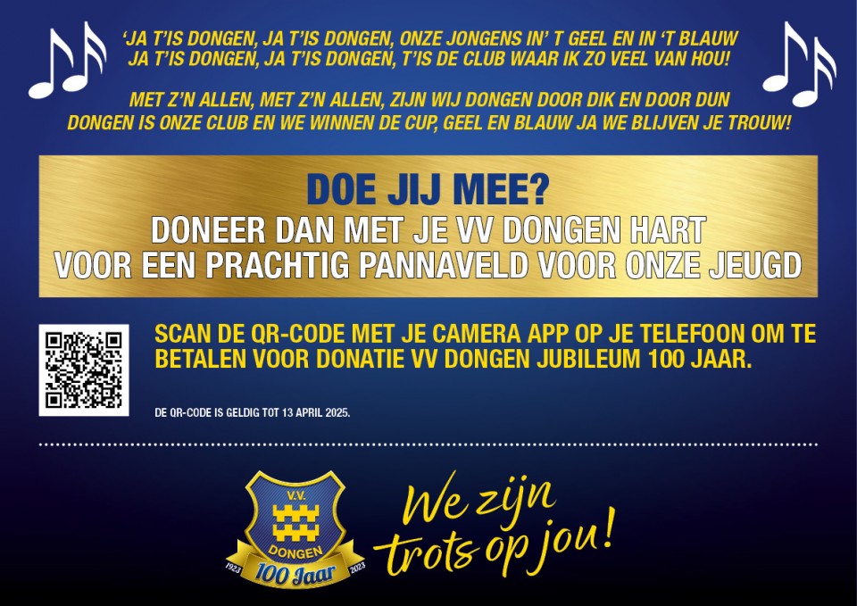 Heb jij een VV Dongen hart en wil je graag een blijvende bijdrage leveren aan het 100-jarig jubileum? Schenk dan een bijdrage voor de realisatie van een fantastisch pannaveld voor de jeugd! Doneren is mogelijk via de QR-code op de afbeelding. De QR-code is geldig tot en met 13 april 2025.